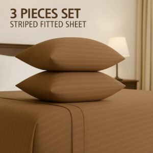KUSTOMDECO Outlet Striped Microfiber Fitted Sheet Set – Queen 150×200 cm – Brown Color – 1 Fitted Sheet & 2 Pillowcases (50×75 cm) – Deep Pocket, Soft, Durable, Wrinkle-Resistant Bedding Set