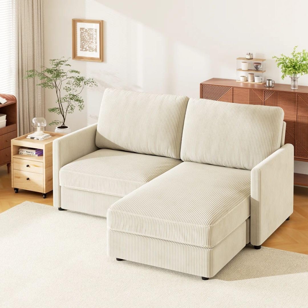 Comfynest 2-Seater Modern Corduroy Sofa with Storage Ottoman – Compact L-Shape Sectional, Feather-Blend Cushions, Solid Wood Frame (Beige)