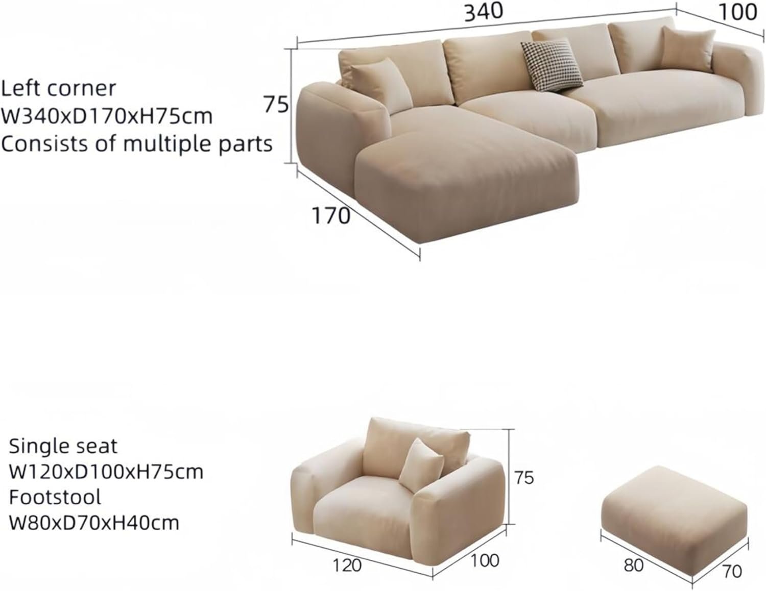 The Comfynest Fleece Fabric Multifunction Sofa Set redefines relaxation and style for modern living spaces. This overstuffed sofa set combines high-density sponge padding and soft fleece fabric for a luxurious seating experience. Its ergonomic design, featuring a curved backrest and armrests, ensures comfort during extended use. Crafted with a solid wood frame, this sofa set is durable, supporting up to 600 kgs with thickened legs for enhanced stability. The versatile modular design fits seamlessly into any space, while its easy-to-clean fabric ensures hassle-free maintenance. Whether lounging, entertaining, or relaxing, this sofa set is perfect for living rooms, offices, and beyond. Dimensions: W340xD170xH75cm. Available in a modern, neutral color to match any décor.