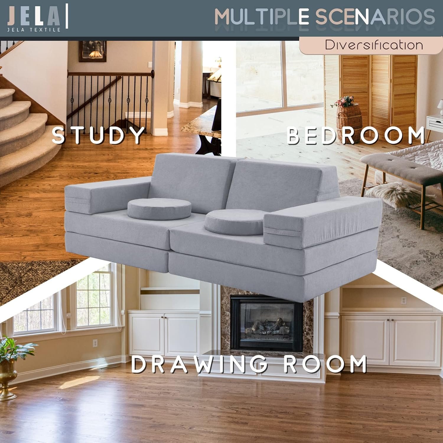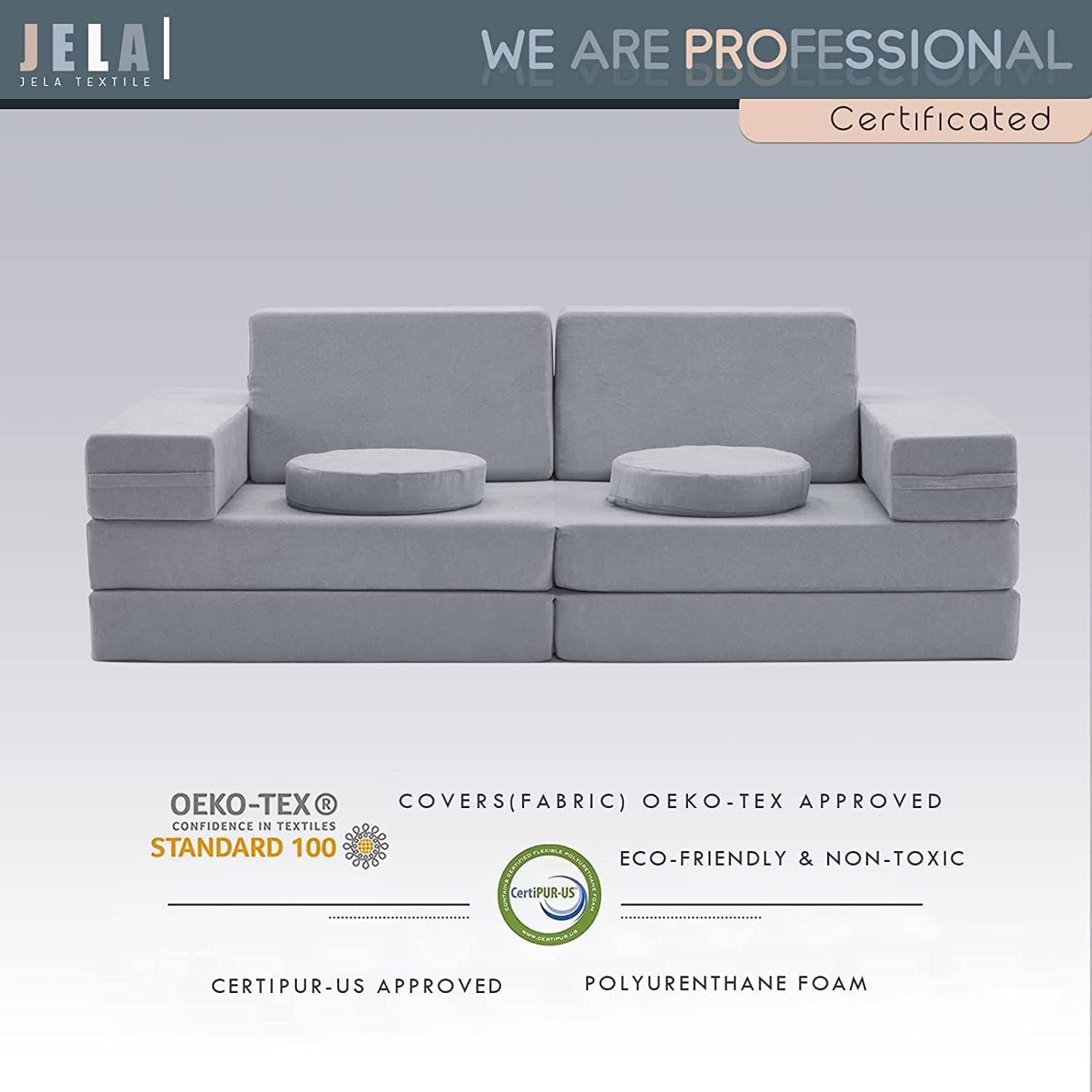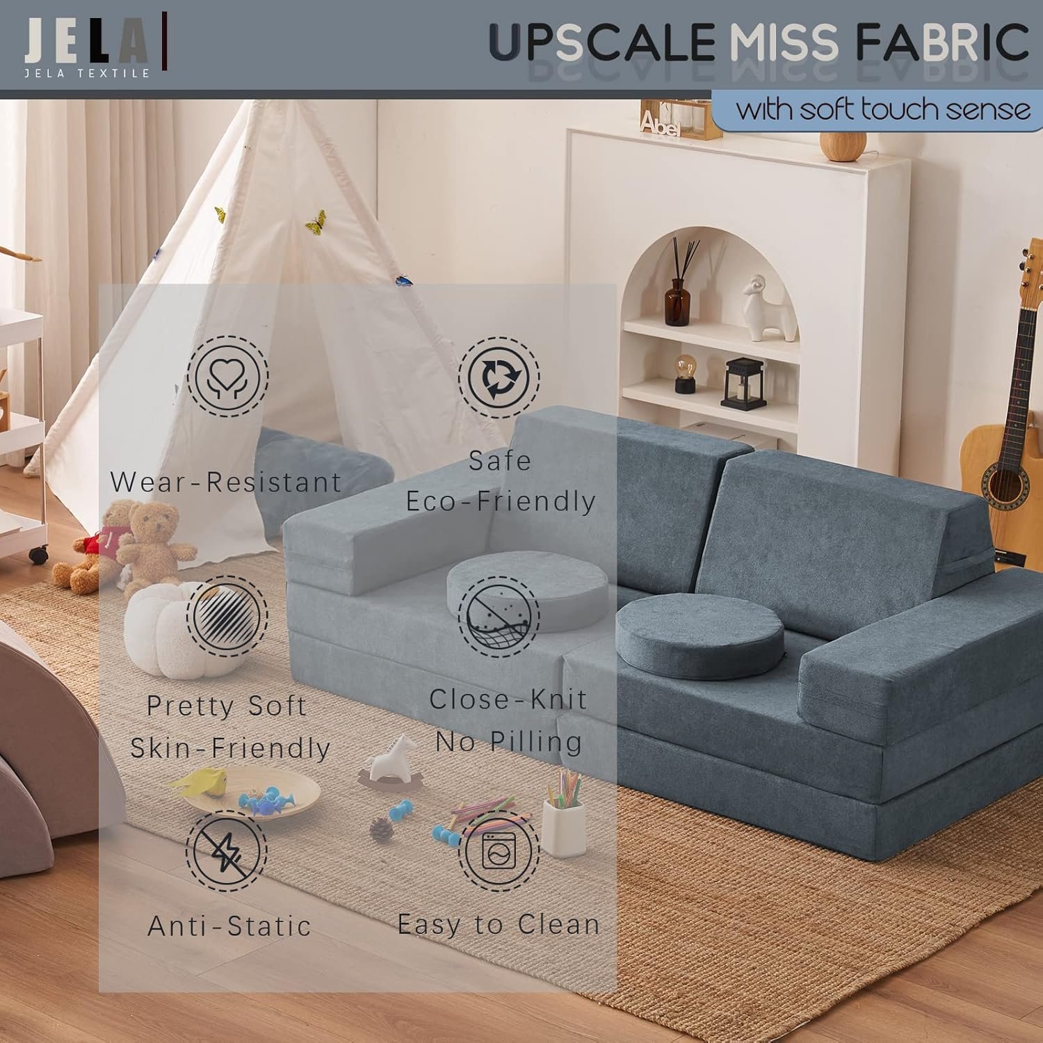Selected material Miss Fabric – Jela modular furniture adapts premium eco-friendly and nontoxic material to care your kids’ health with soft touch sense. The whole product has been passed CertiPUR-US which prohibits any CFCs use, or any harmful elements through the whole manufacturing. The whole product uses upscale miss fabric to make you feel unique and superb texture.