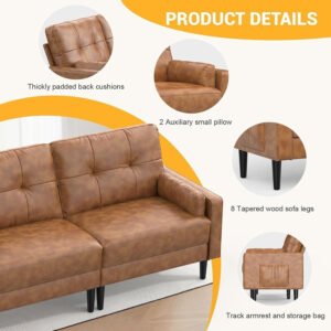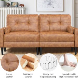 Karnak 2-Seater Modern Sofa – Thick Cushions & Pillows, Linen Fabric, Side Storage Pockets, Compact & Comfortable Couch for Living Room, Bedroom, Office (Leather, Brown)