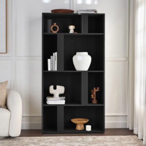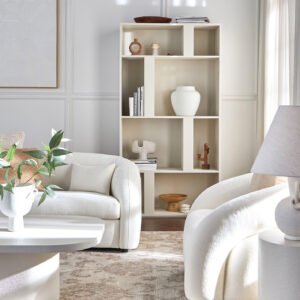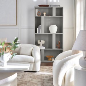 FUNCTIONAL STORAGE SPACE – With 4 shelves and unique compartments, this cabinet provides versatile room for books, decorative pieces, or essentials, blending practicality with design. وحدة عرض عملية ومتعددة الاستخدامات.