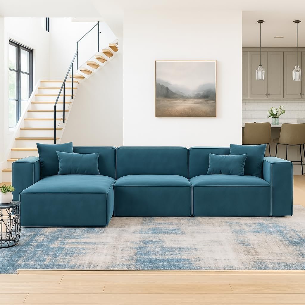 karnak Carol Corner 3 Seater L-Shape Velvet Upholstery Sofa Couch (BLUE) for Living Room Furniture