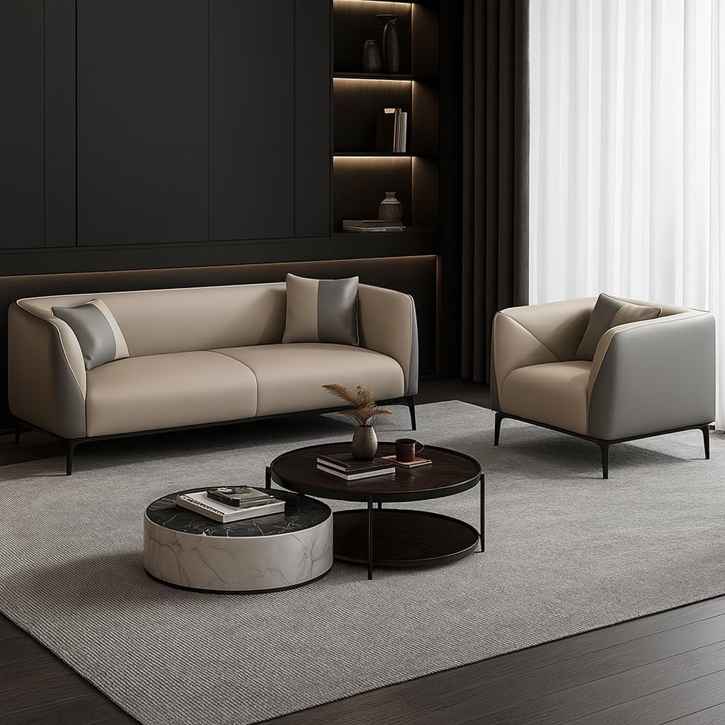 Karnak Contemporary Faux Leather Tuxedo Sofa | Water Resistant Design | Foam Seat Cushions | Beige/Gray | Modern Sofa | Couch | Living Room Furnitur