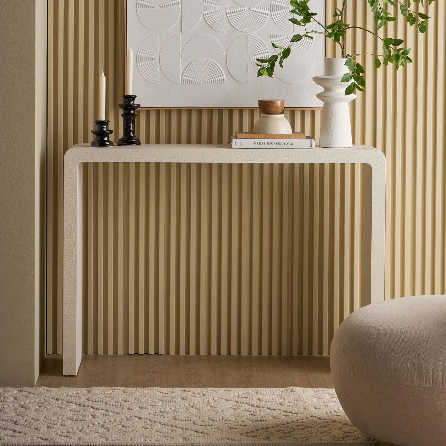 - STRIKING MODERN DESIGN – The Karnak Edgy Console Table stands out with its unique plaster finish and bold style. Perfect for hallways, living rooms, or entryways, it adds a refined touch to UAE homes. (طاولة كونسول عصرية).