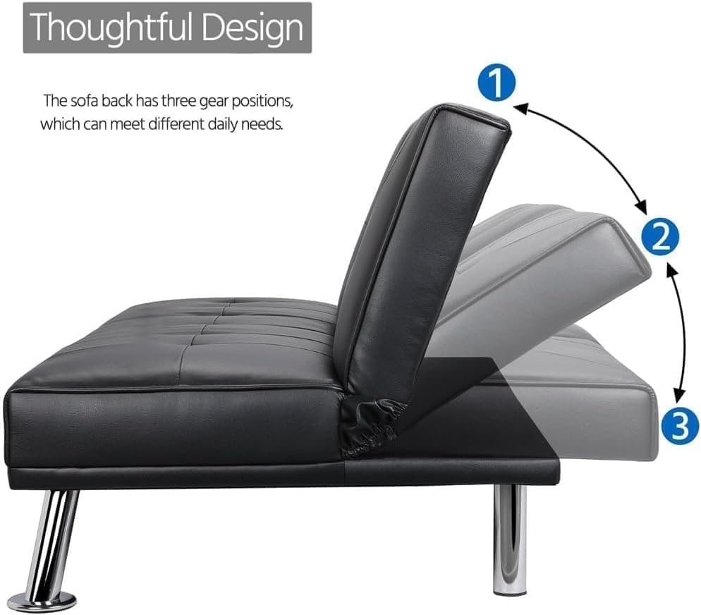 Karnak Futon Sofa Bed, Faux Leather Lounge Couch for Living Room, Small Futon Couch for Small Space w/Cup Holders and Armrest, 3 Adjustable Positions. (BLACK, WITHOUT ASSEMBLY)