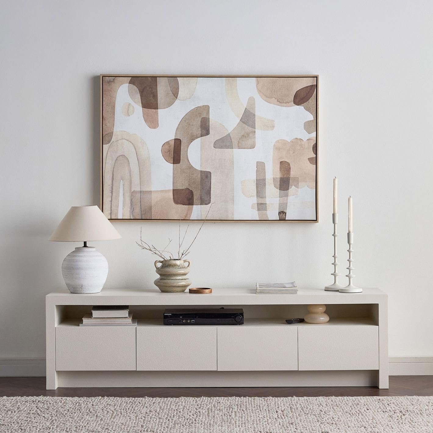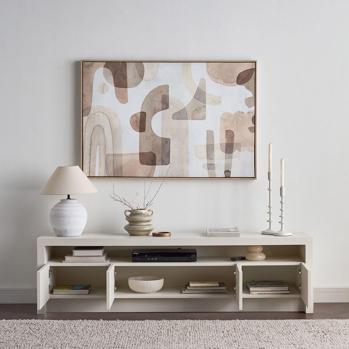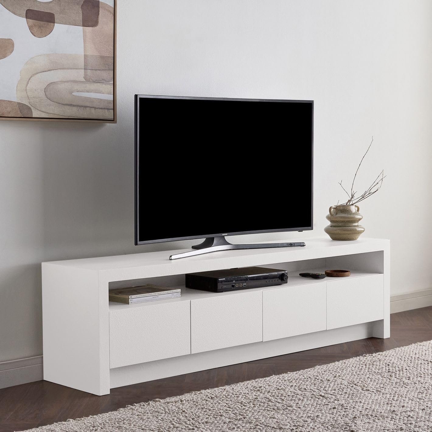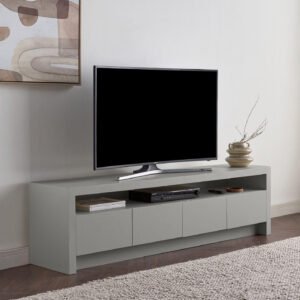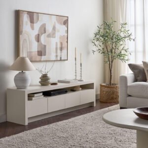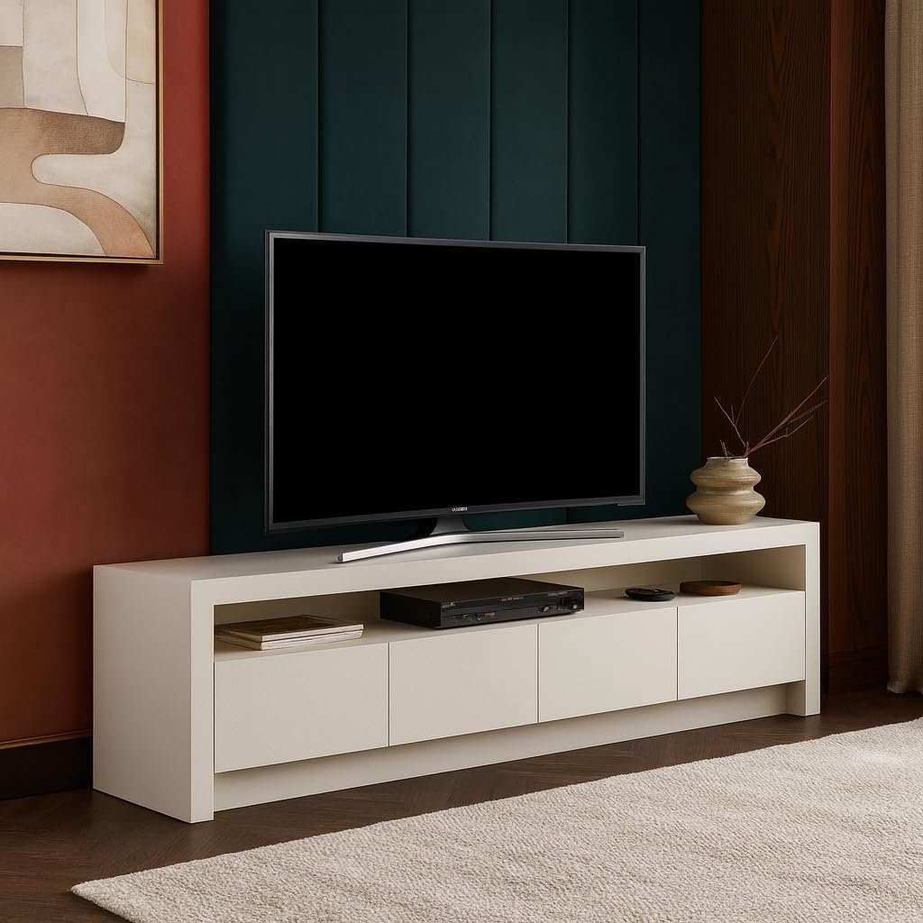 The Karnak Horizon TV Unit combines minimalist design with practical storage, making it ideal for contemporary UAE homes. Featuring a refined plaster finish, smooth surfaces, and clean lines, it adds elegance to any living space. With four spacious doors and a central open shelf, it provides smart storage for consoles, remotes, and accessories. Built with durable MDF and engineered wood legs, this modern tv stand ensures both style and strength, fitting seamlessly into Dubai, Abu Dhabi, and beyond.