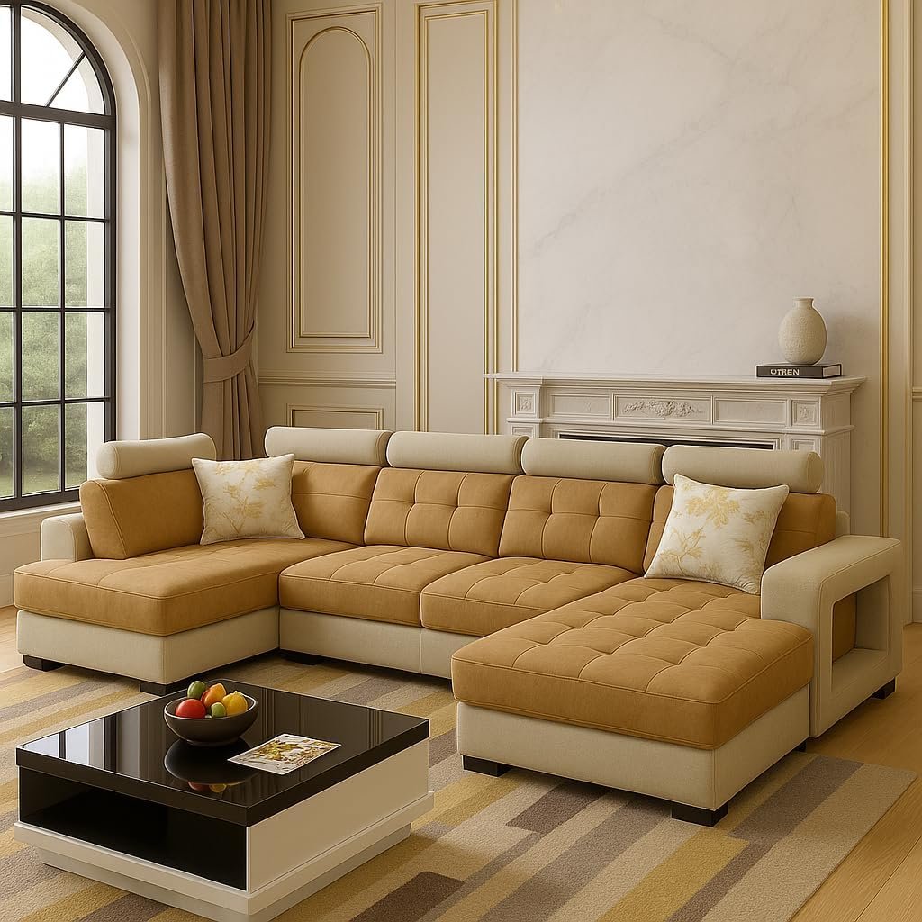 Karnak Sectional Sofa Set, Solid Wood Sofa for Living Room Furniture Modern Corner Fabric Upholstered Sofa Set (Cream Brown)