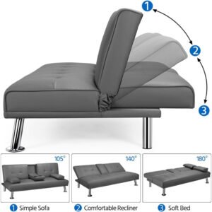 Classic DesignThis sofa set intergrated with Comfort and Luxury, it highlights the delicate faux leather, while the chromed metal feet make the work more modern. The removable armrests is more convenient for you to use. This futon sofa bed is made from thickened high density sponge, which makes the cushion more resilient and will not sink like normal sofa after a long-term use,solid wooden frame and chromed iron feet ensure long service life,leather fabric clean and easy to care for. Multipurpose Versatile folding sofa, Backrest has 3 adjustable angles,when the sofa during the day, when the bed to sleep at night, kill two birds with one stone,come with 2 hidden cup holders, make a cup of coffee, you can enjoy your talk with your friends and relax. Occasion with a timeless modern sofa to fit any theme, It’s the perfect size and looking suit for your Living room, Bedroom, Office and Apartments, A simple and advanced feeling, which can decorate your space and make your house more atmospheric. This sleeper sofa bed crafted a classic design where tufted details are applied to increase its aesthetic, making it not only a multi-functional sofa bed but also a decorative piece to your living space. Stay prepared for overnight guests by taking advantage of the removable arm pillows , hidden armrest with cup holders and adjustable back to switch from sofa to a comfy bed in just seconds. All the legs, screws and tools are hidden at the bottom of the sofa seat, open the zipper and you will find them. With detailed instructions and a complete kit, you can easily assemble within 15 minutes to get a complete couch bed. Any questions, please contact us, we will provide you with the most professional customer service.