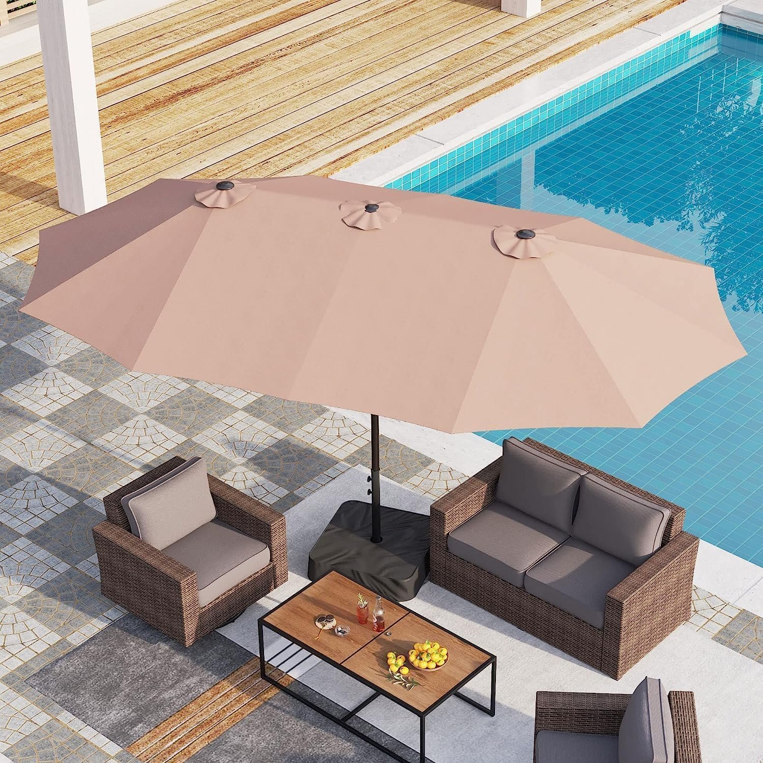 Kustom Deco Extra Large Patio Umbrella with Base, 4.5 m Double-Sided, Beige, with Metal Stand for Outdoor Garden