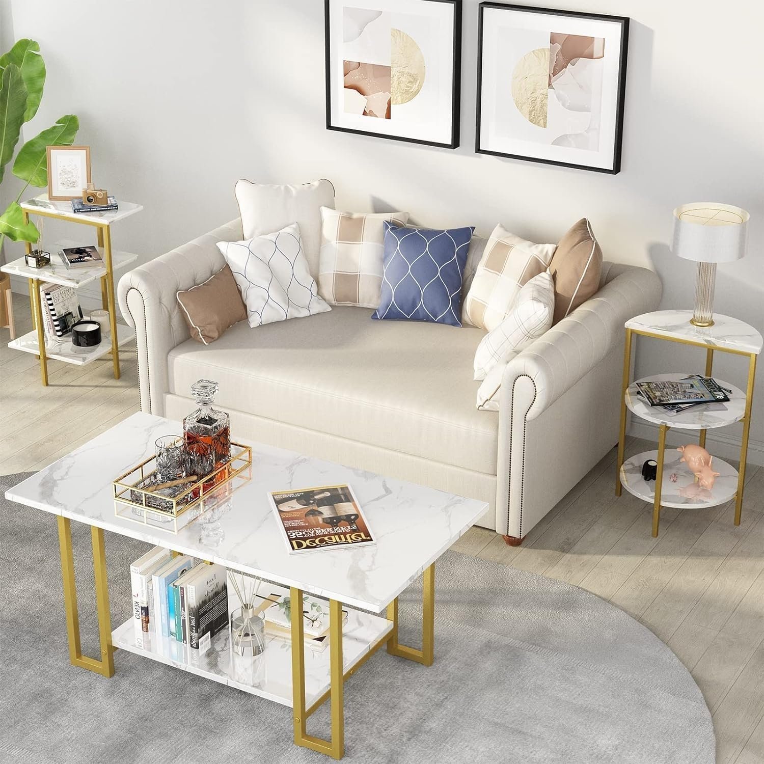 - ELEGANT DESIGN: Modern 3-piece coffee table set featuring luxurious white marble-look tops complemented by sleek gold-finished metal frames