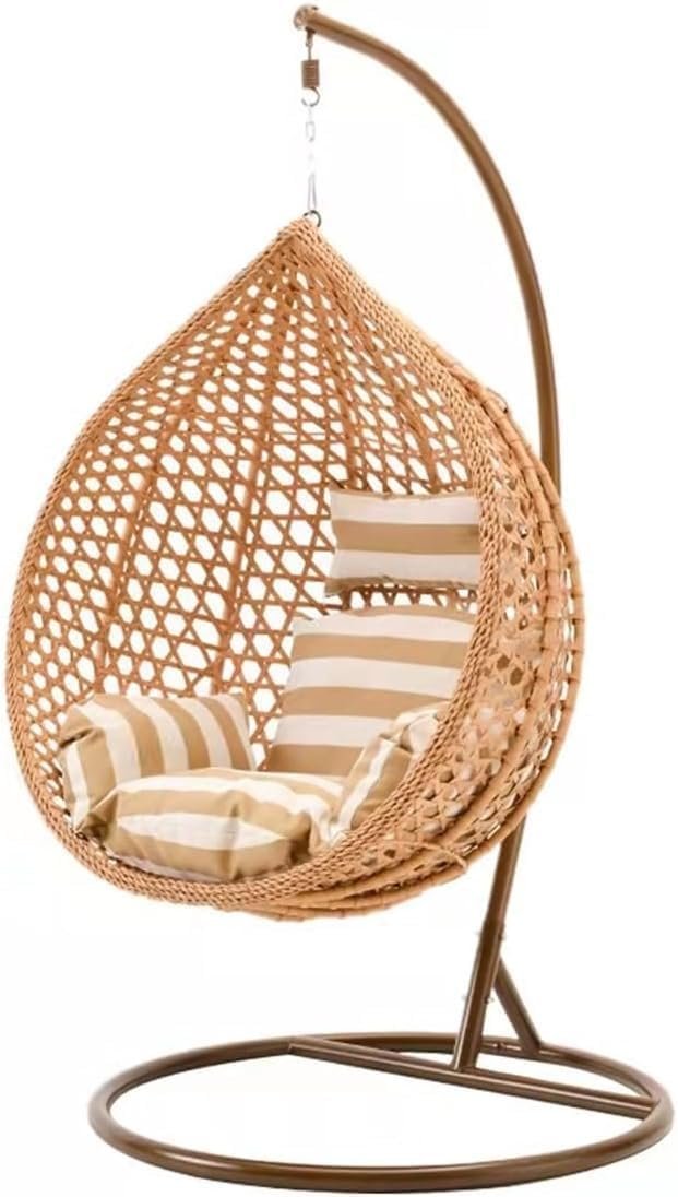 Transform your living space with this stunning Nordic-style hanging basket chair. The beautifully woven wicker design creates an eye-catching teardrop silhouette that adds a touch of bohemian elegance to any room. The chair features comfortable striped cushions in neutral beige and white tones, perfectly complementing the natural rattan weave. The sturdy metal stand with its curved support arm ensures stability and safety, whilst the spacious cocoon-like seat offers a cosy retreat for relaxation. Perfect for both indoor and outdoor spaces, this versatile piece works wonderfully in balconies, terraces, gardens, or as a statement piece in your living room. The open-weave pattern allows for optimal airflow, making it comfortable in warm weather. The chair’s contemporary design harmoniously blends with both modern and traditional décor schemes, making it an ideal addition to any home seeking that perfect balance of style and comfort.