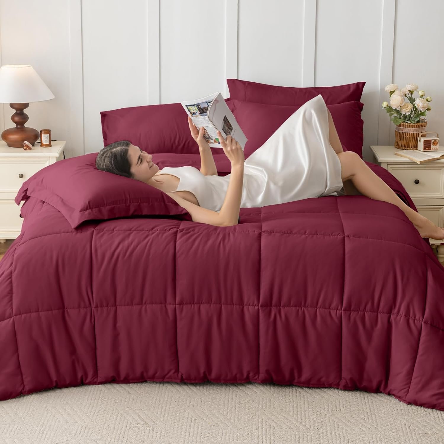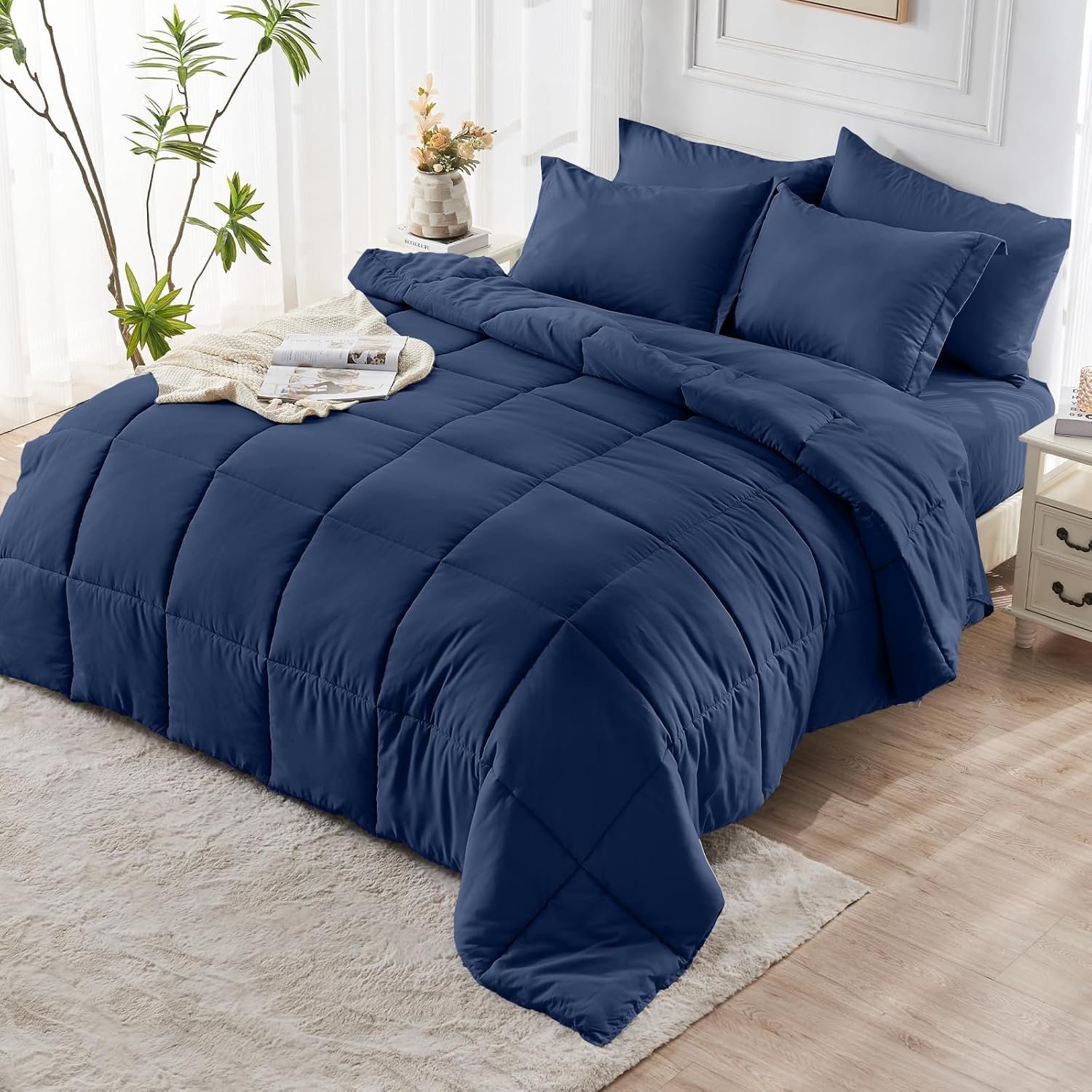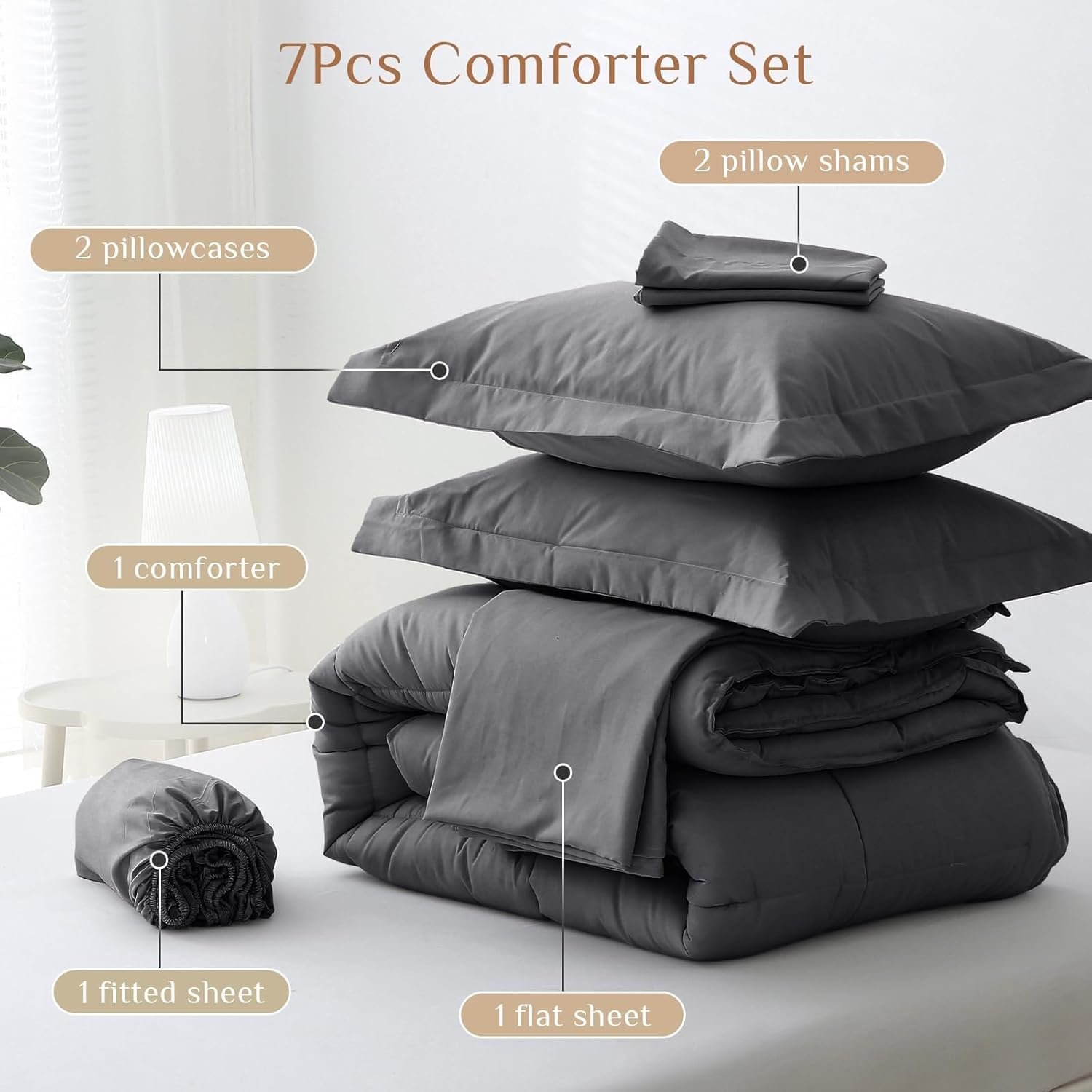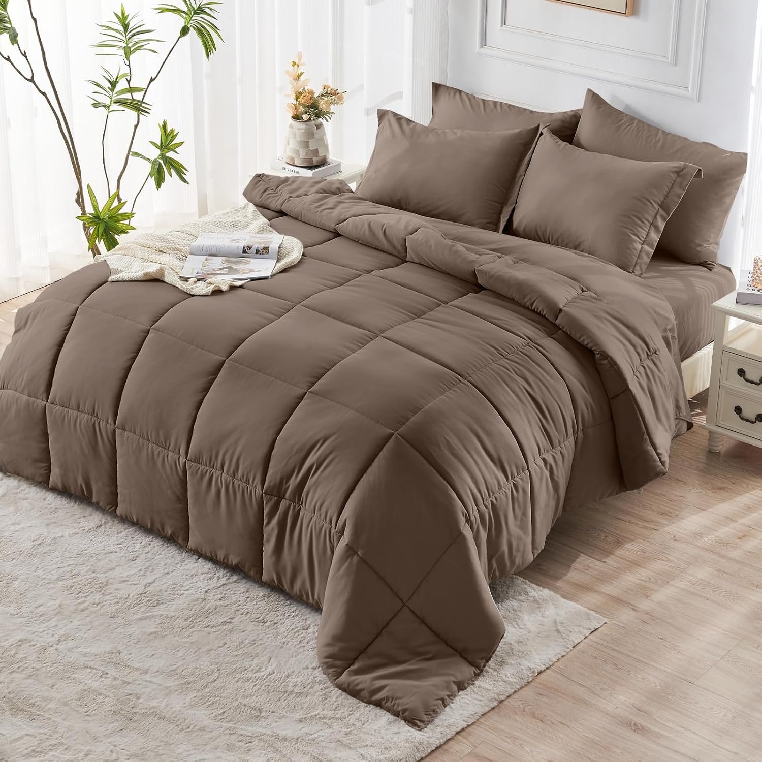 KUSTOMDECO Down Alternative 7pcs Comforter Set Brown – Ultra Soft Microfiber Duvet with 250GSM Filling – Queen Size 220×240 cm – Lightweight, Breathable & Hypoallergenic Bedding for All Seasons