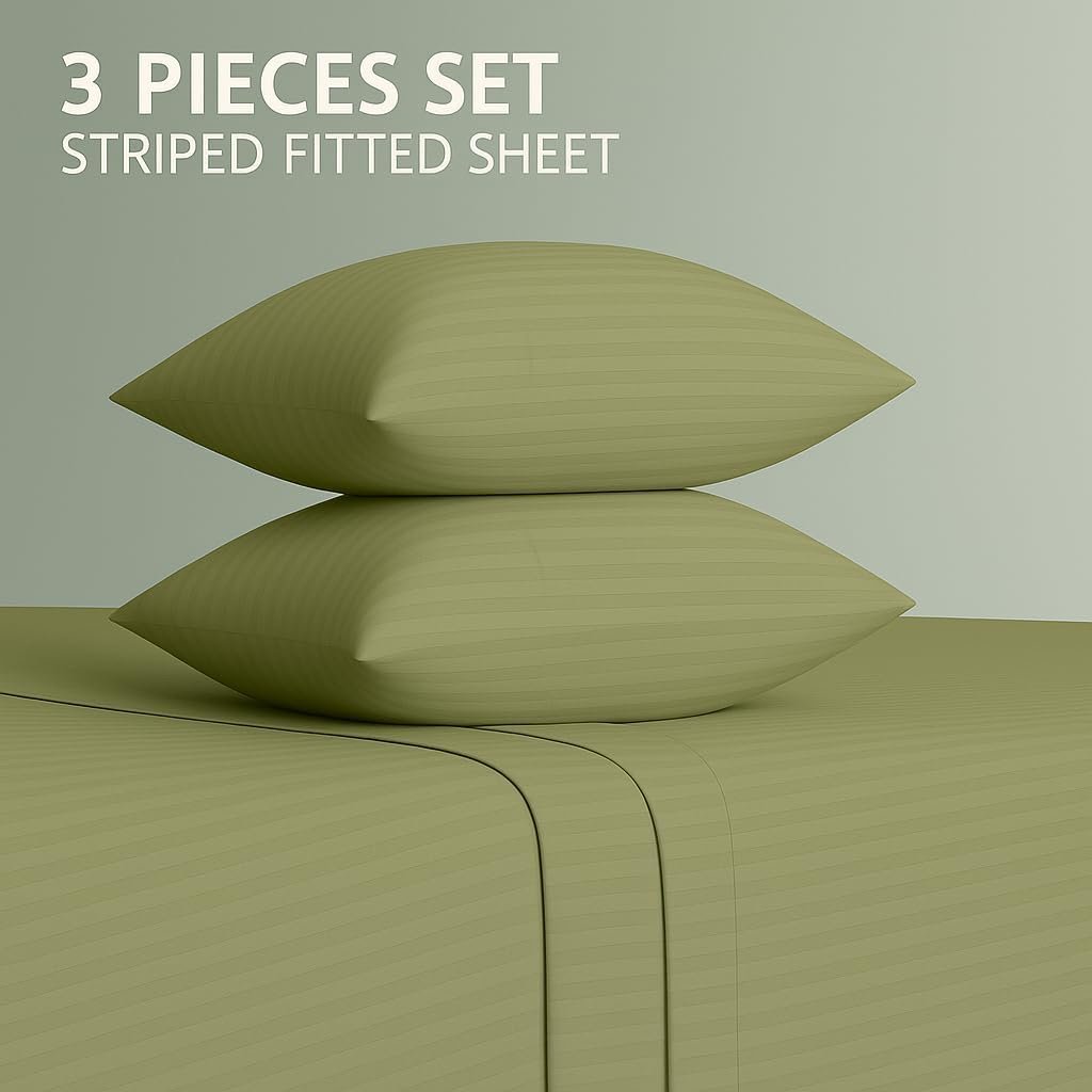 KUSTOMDECO Outlet Striped Microfiber Fitted Sheet Set – Double 120×200 cm – Sea Green Color – 1 Fitted Sheet & 2 Pillowcases (50×75 cm) – Deep Pocket, Soft, Durable, Wrinkle-Resistant Bedding Set