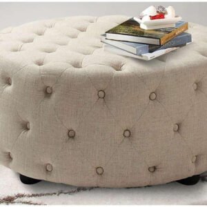 Linen Tufted Round Ottoman – Upholstered Ottoman or Bench, Multi-Purpose Seating for Living Room or Bedroom