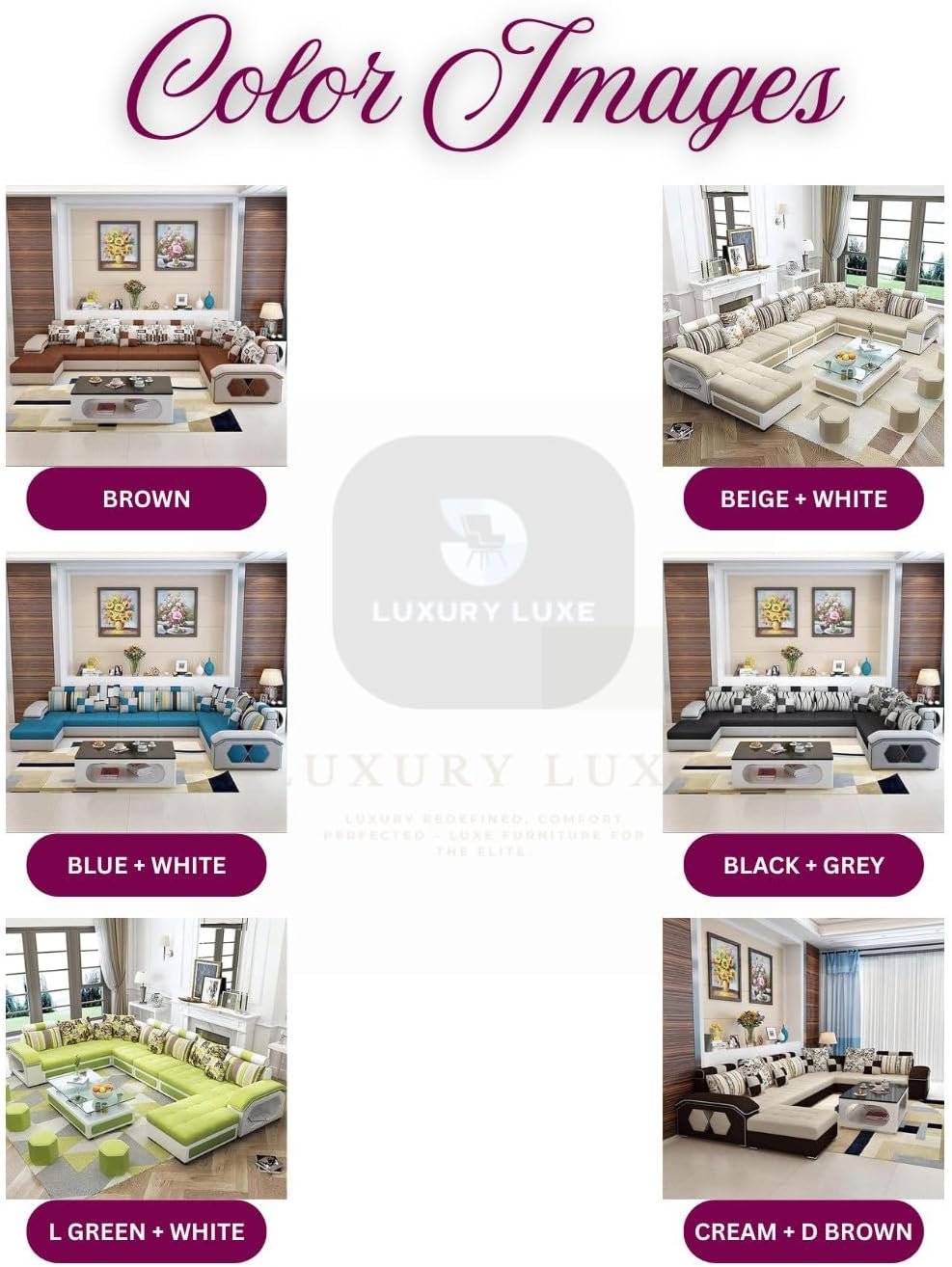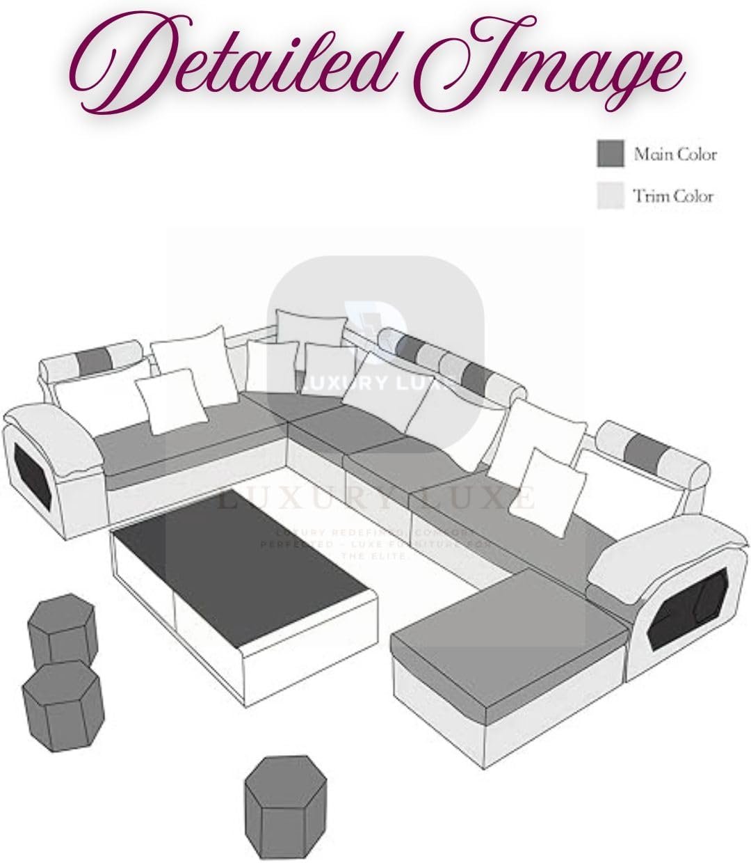 🌟 Luxury Luxe U-Shape 7-Seater Modern Sofa Set 🌟 ✨ Premium Fabric | Solid Wood Frame | Supersoft High-Density Foam | Space-Saving Design | Multiple Colors 🛋️ PRODUCT DESCRIPTION: Transform your living space into a haven of comfort and elegance with the Luxury Luxe U-Shape 7-Seater Modern Sofa Set. Designed for ultimate relaxation and style, this sofa set combines premium quality and ergonomic engineering to elevate your home decor. 🔑 KEY FEATURES & BENEFITS 🔑 ✅ Luxurious U-Shape Design: Perfect for family gatherings or entertaining guests, the U-shaped configuration offers ample seating (7-seater) and fosters a cozy, inclusive atmosphere. ✅ Supersoft High-Density Foam Cushions: Sink into plush, body-hugging comfort with cushions that retain shape for years, ensuring zero sagging. ✅ Solid Wood Frame + Premium Fabric: Built with 100% kiln-dried hardwood for unmatched durability, paired with stain-resistant, premium fabric upholstery available in 6+ elegant colors. ✅ Ergonomic Web Suspension System: Advanced woven belt support and reinforced backrests provide spine-friendly comfort and long-lasting durability. ✅ Space-Saving Modern Aesthetic: Compact yet spacious, this sofa fits seamlessly into living rooms, halls, or apartments, blending contemporary style with practicality. ✅ Easy Assembly: Hassle-free setup with pre-attached components and clear instructions. 🌈 STYLE YOUR SPACE: Choose from multiple color options (Beige, Grey, Navy, Burgundy, Teal, Charcoal) to match your interior theme. The modular, interchangeable fabric covers let you refresh your decor effortlessly. 📏 DIMENSIONS: Length: 139.76 inches (355 cm) Depth: 34.25 inches (87 cm) Height: 24.01 inches (61 cm) Weight: 130 kg 🌟 WHY CHOOSE LUXURY LUXE? ✅ Premium Comfort ✅ Unbeatable Durability ✅ Trendsetting Design ✅ Easy Maintenance 🎯 PERFECT FOR: Living rooms, halls, home theaters, or open-plan spaces. Ideal for families, hosting guests, or creating a statement piece in modern interiors.