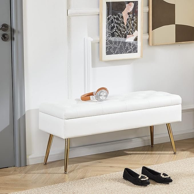 Luxury Luxe White Faux Leather Storage Ottoman Bench – Modern & Stylish Addition to Your Home ✨ Sleek & Elegant Design: This modern white faux leather storage ottoman bench adds a touch of luxury and sophistication to any room. With its tufted top and gold chrome legs, it seamlessly blends with contemporary decor while offering ample storage. 💪 Sturdy & Durable: Constructed with high-quality materials, including a metal frame and multi-layered wood board, this bench supports up to 300 lbs. No wobbling or squeaks – just solid comfort and support. 🛠️ Easy Assembly: Assembly is a breeze! With included screws, tools, and clear instructions, you’ll have your storage bench set up in under 5 minutes. 🛋️ Versatile Functionality: Perfect for various spaces, this bench serves as a bedroom storage bench, entryway bench, or living room ottoman. Use it for seating, as a footrest, or to organize blankets, shoes, and more. 🔒 Safe & Convenient Storage: The lift-off top with a safety hinge ensures smooth opening and closing. Store your essentials with ease, keeping your space neat and clutter-free. Product Dimensions: 35.1D x 101.6W x 43.2H cm Weight Capacity: 300 lbs Color: White Material: Faux Leather, Metal Frame Weight: 11.52 kg Perfect for: Bedroom, Living Room, Entryway, or as a Stylish Footrest. 💫 Why You’ll Love It: Luxurious Design Sturdy & Safe Easy to Assemble Spacious Storage Versatile Use Add this Luxury Luxe White Faux Leather Storage Ottoman Bench to your home today and enjoy a blend of style, comfort, and organization in one piece of furniture!