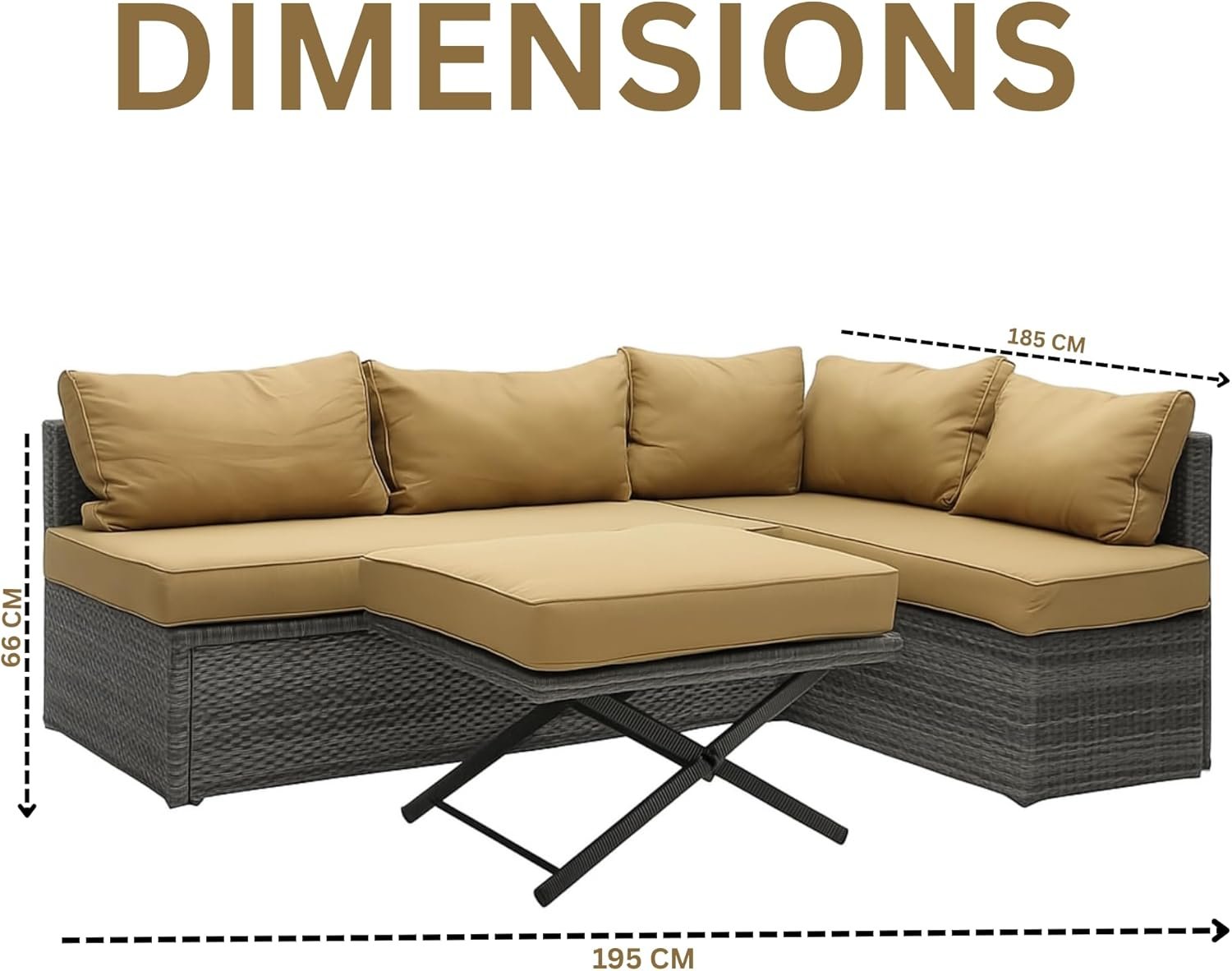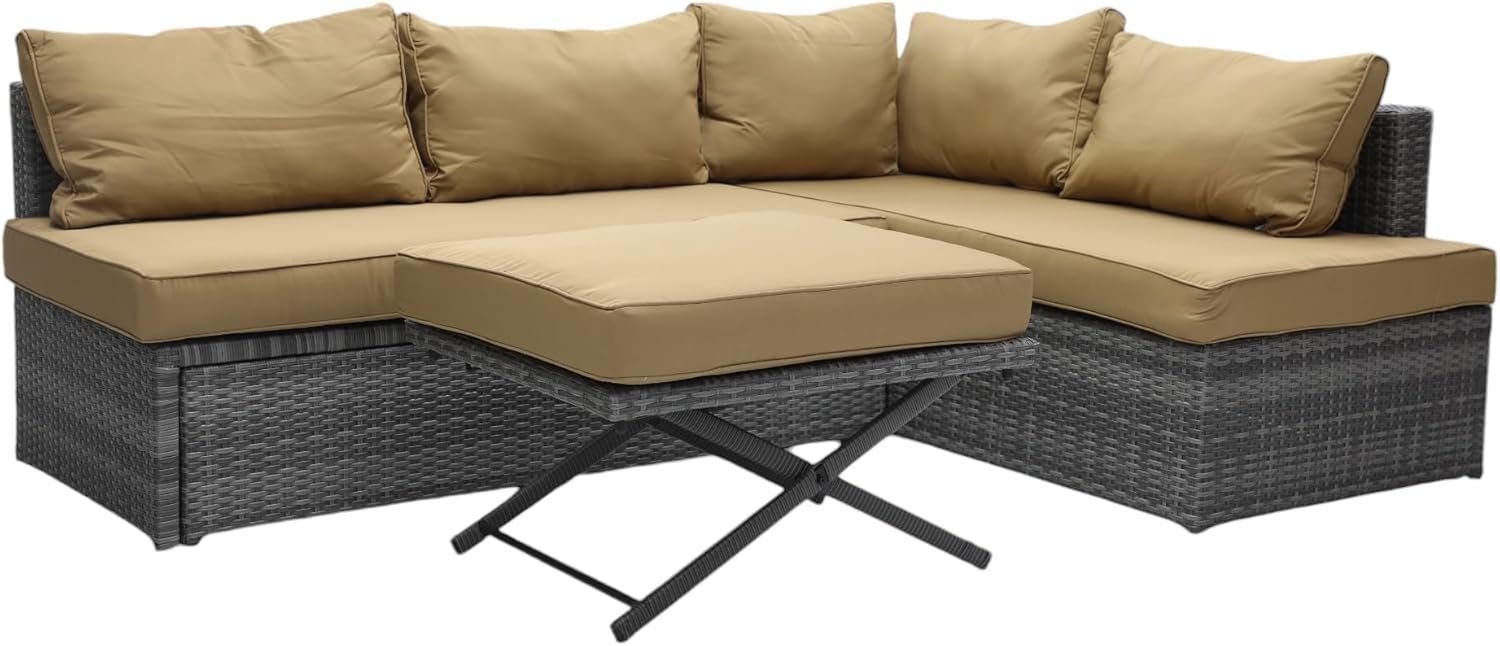 Transform your garden, balcony, or patio into a luxurious outdoor retreat with this 5-piece L-shaped outdoor furniture set from Multi Home Furniture. Designed for style, comfort, and functionality, this modular rattan patio sofa set includes a corner couch configuration, soft golden cushions, and a matching rattan coffee table—perfect for entertaining or relaxing under the sun.