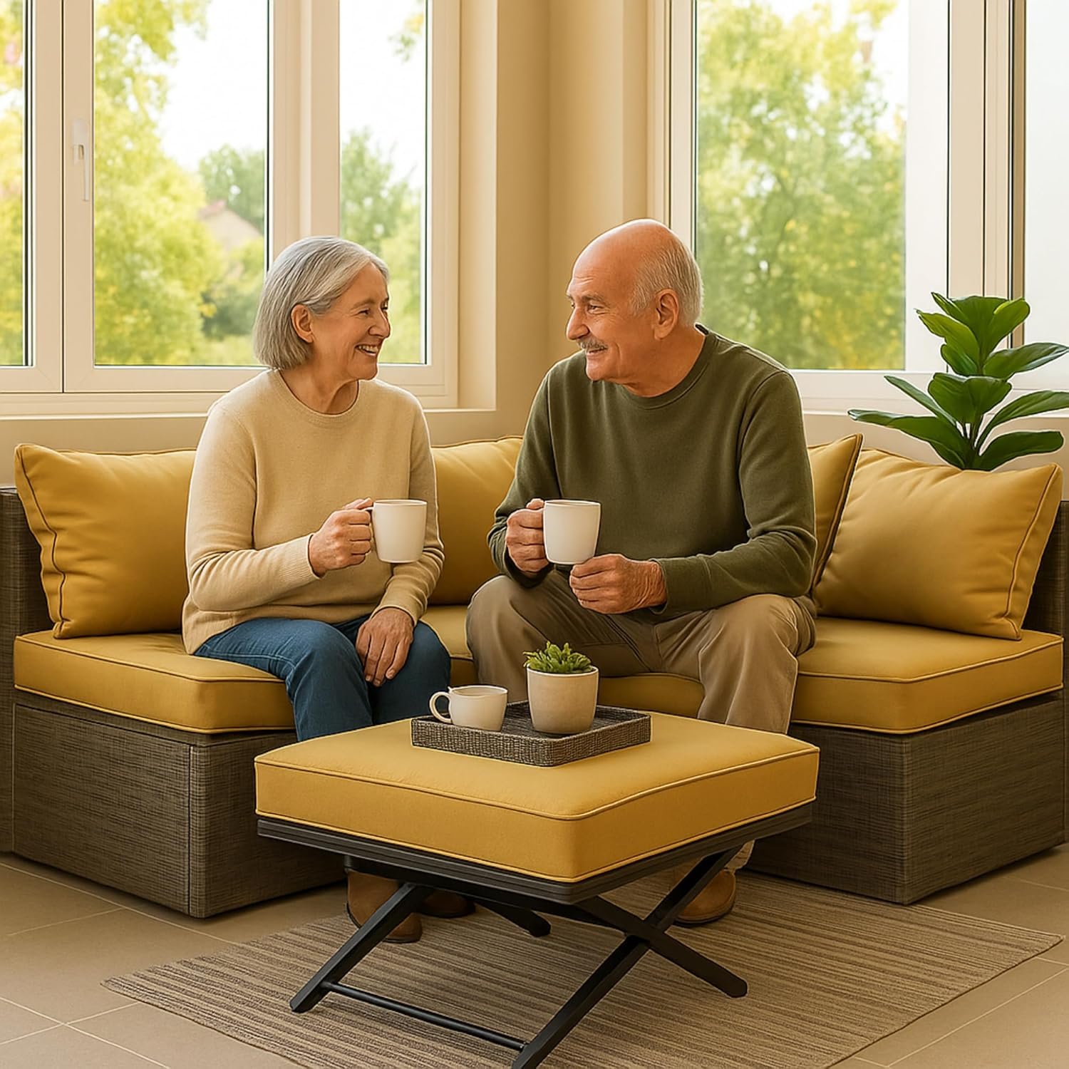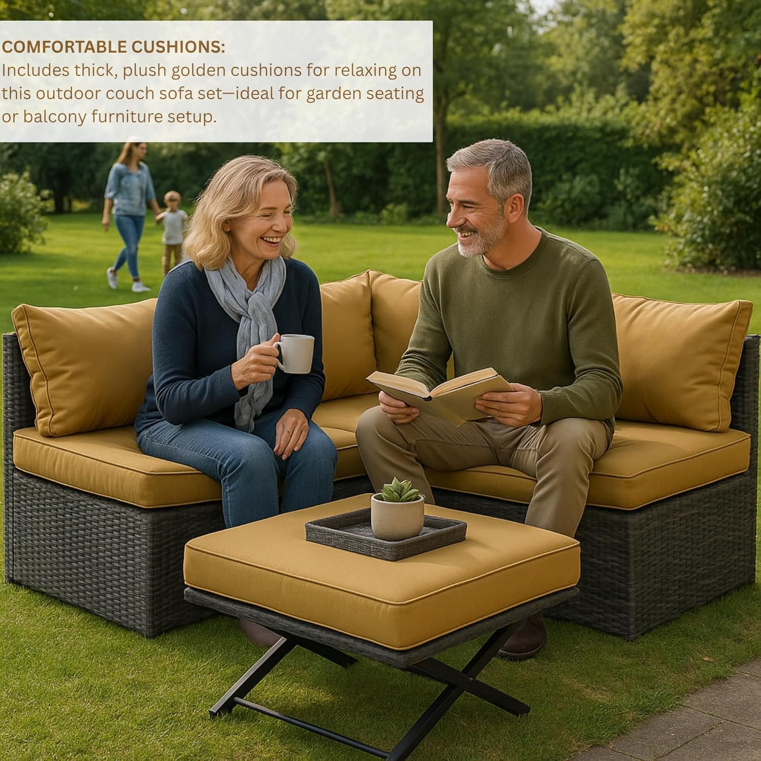 From casual outdoor brunches to evening tea with family, this outdoor couch sofa offers the perfect combination of beauty, durability, and relaxation. The elegant grey and golden color contrast complements modern and classic decor styles alike.