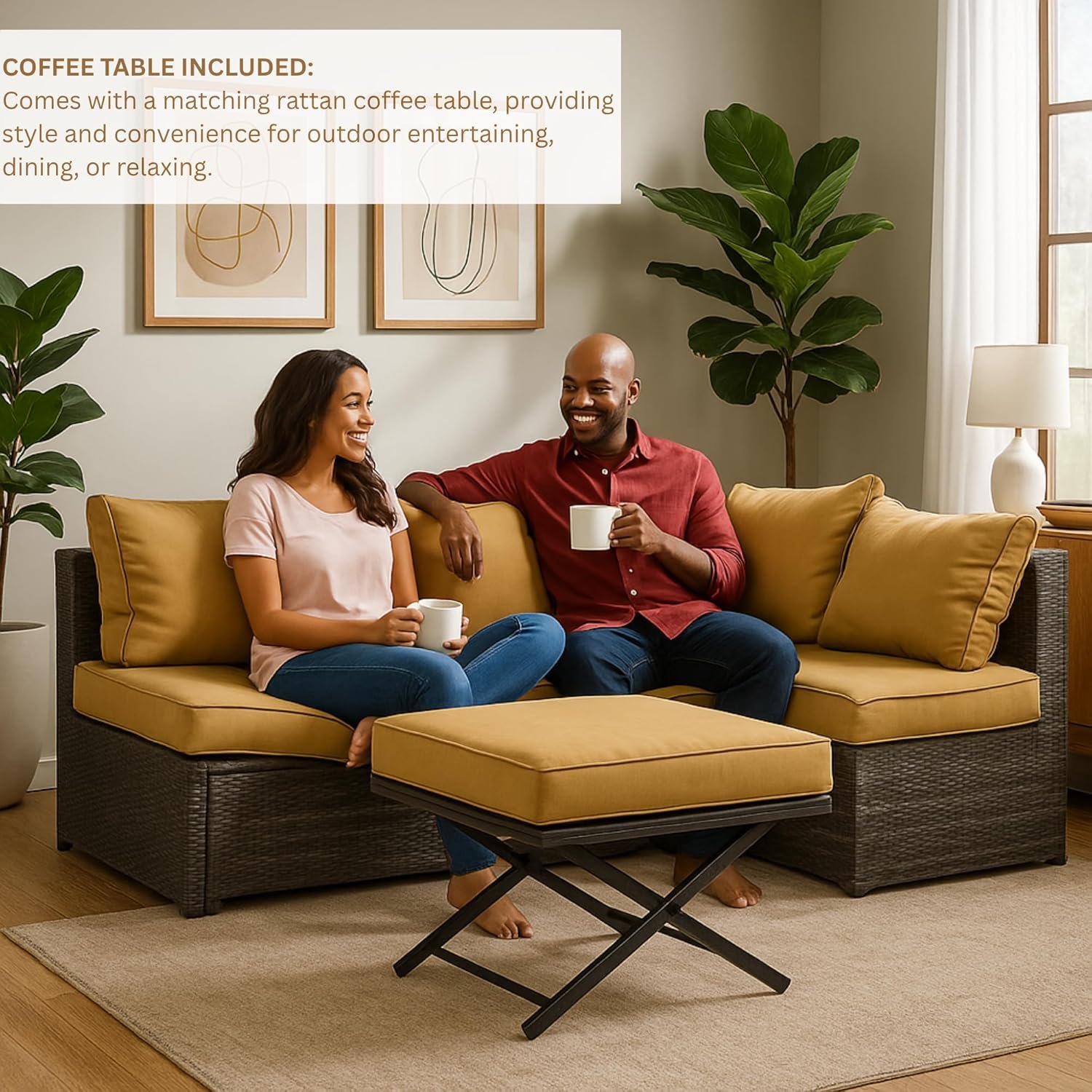 The modular design allows for flexible arrangements—ideal as a corner sofa or sectional setup. Thick, plush golden cushions provide ergonomic seating comfort, making this an ideal couch for lounging, reading, or hosting guests. The low-maintenance rattan is waterproof, UV-resistant, and easy to clean, making this set a smart investment for your outdoor lifestyle.
