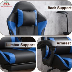 Upgrade your gaming setup or home workspace with the Multi Home Furniture Black & Blue Gaming Chair—a high-back ergonomic chair designed for long gaming sessions, office work, and full-body relaxation. Built with a racing-style design, this recliner chair combines stylish aesthetics with maximum functionality. The ergonomic chair features adjustable lumbar support, a soft headrest cushion, padded armrests, and a retractable footrest, making it one of the best gaming chairs for gamers and professionals alike. Whether you’re looking for a chair gaming experience with back support or an ergonomic office chair that enhances posture and comfort, this versatile model delivers.