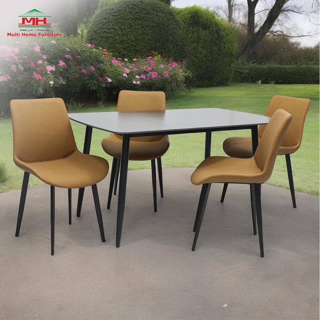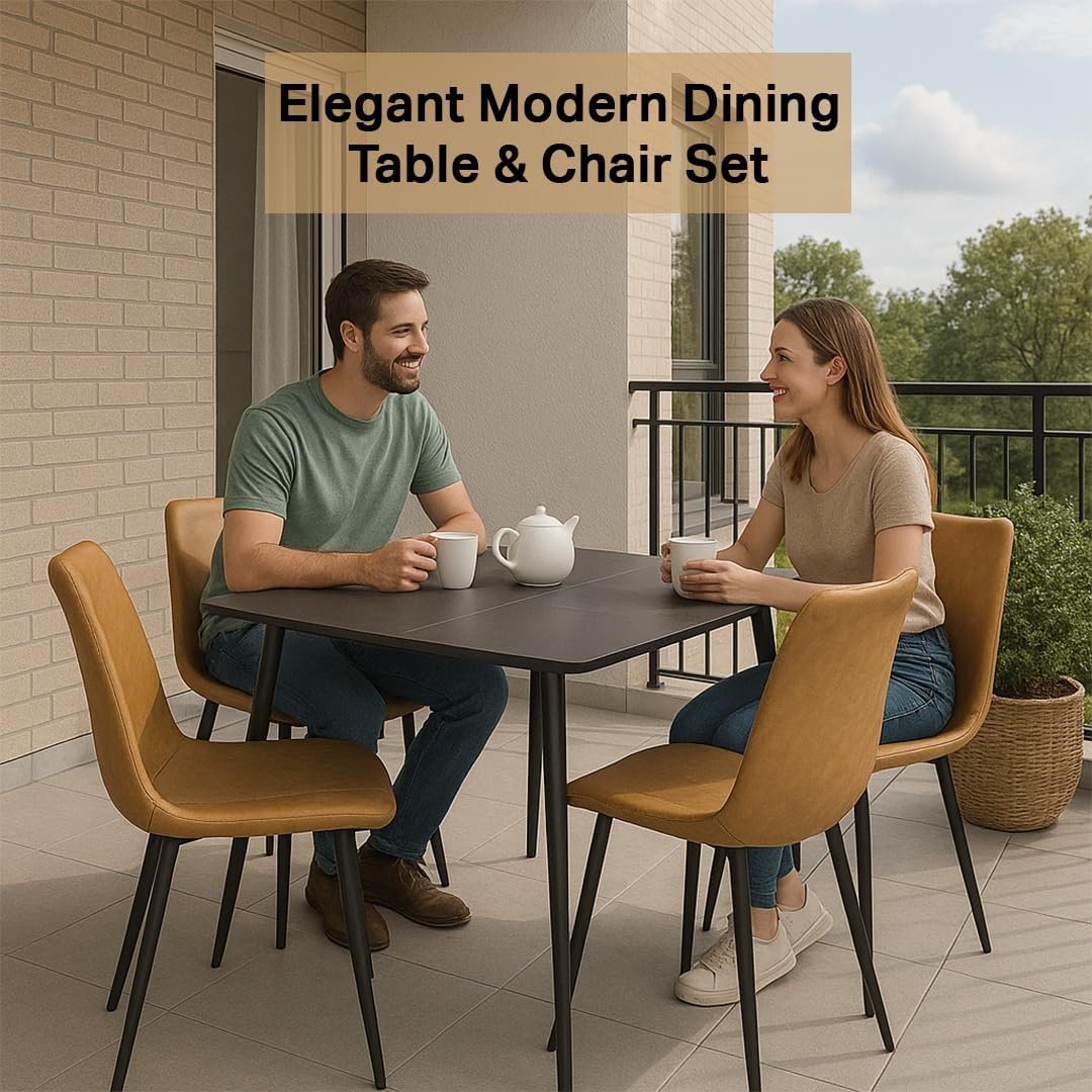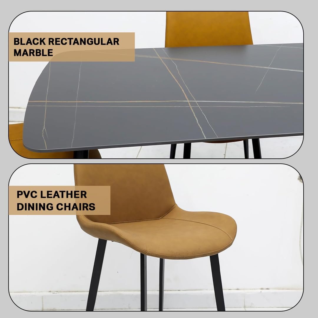 • Elegant Modern Dining Table Set 4 Seater: Stylish black rectangular marble top finish with durable steel legs and 4 brown PVC leather dining chairs, ideal for dining room, kitchen, or living space.