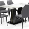 The grey marble dining table is made from sintered stone, a material stronger and more durable than traditional marble, offering excellent resistance to scratches, stains, and heat. Supported by sturdy black steel legs, it provides stability and can hold up to 66–121 lbs. The black PVC leather dining chairs are cushioned for comfort and feature steel legs for lasting durability, making them suitable for both daily use and special occasions.