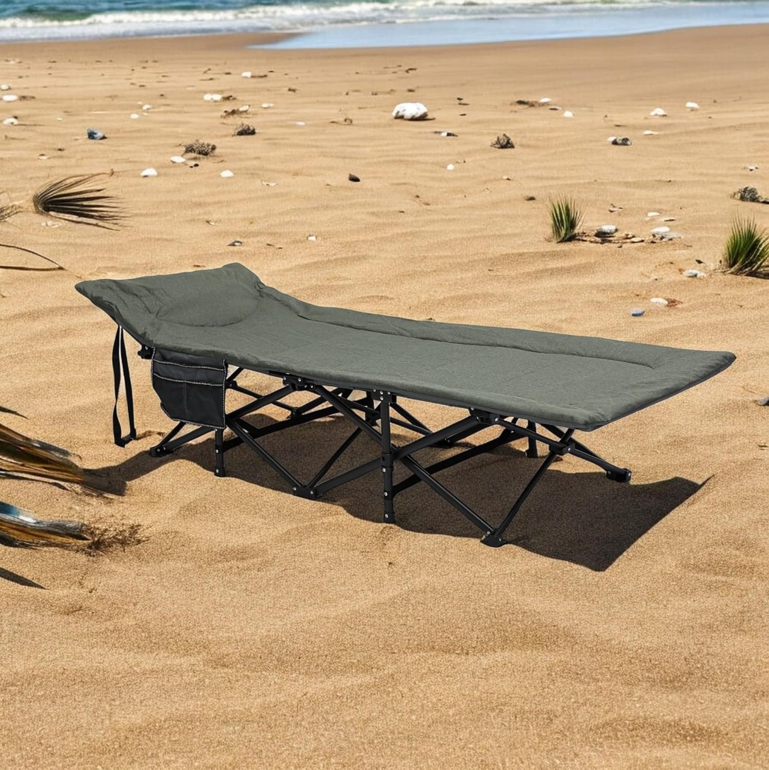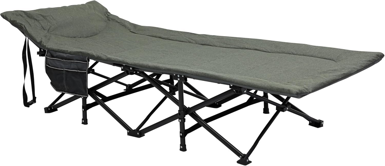 Experience ultimate outdoor comfort with this Heavy-Duty Folding Camping Cot. Featuring a padded mattress and an adjustable backrest, this cot offers superior support and comfort for restful sleep or lounging. Its sturdy steel frame supports up to 130kg, making it reliable for various outdoor adventures. The foldable design allows for quick setup and effortless portability. Equipped with a convenient side pocket, you can keep your essentials like phones, water bottles, or books close at hand. Perfect for camping, hiking, or even as an extra bed at home, this cot is designed for durability and ease of use.