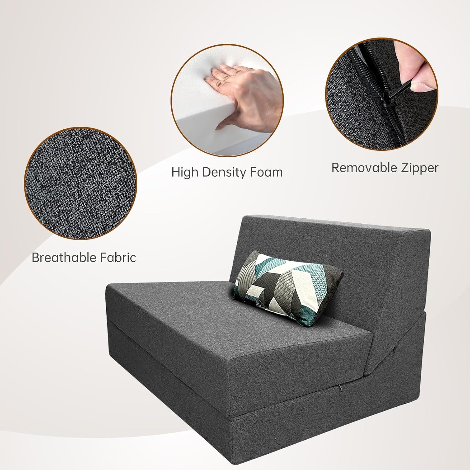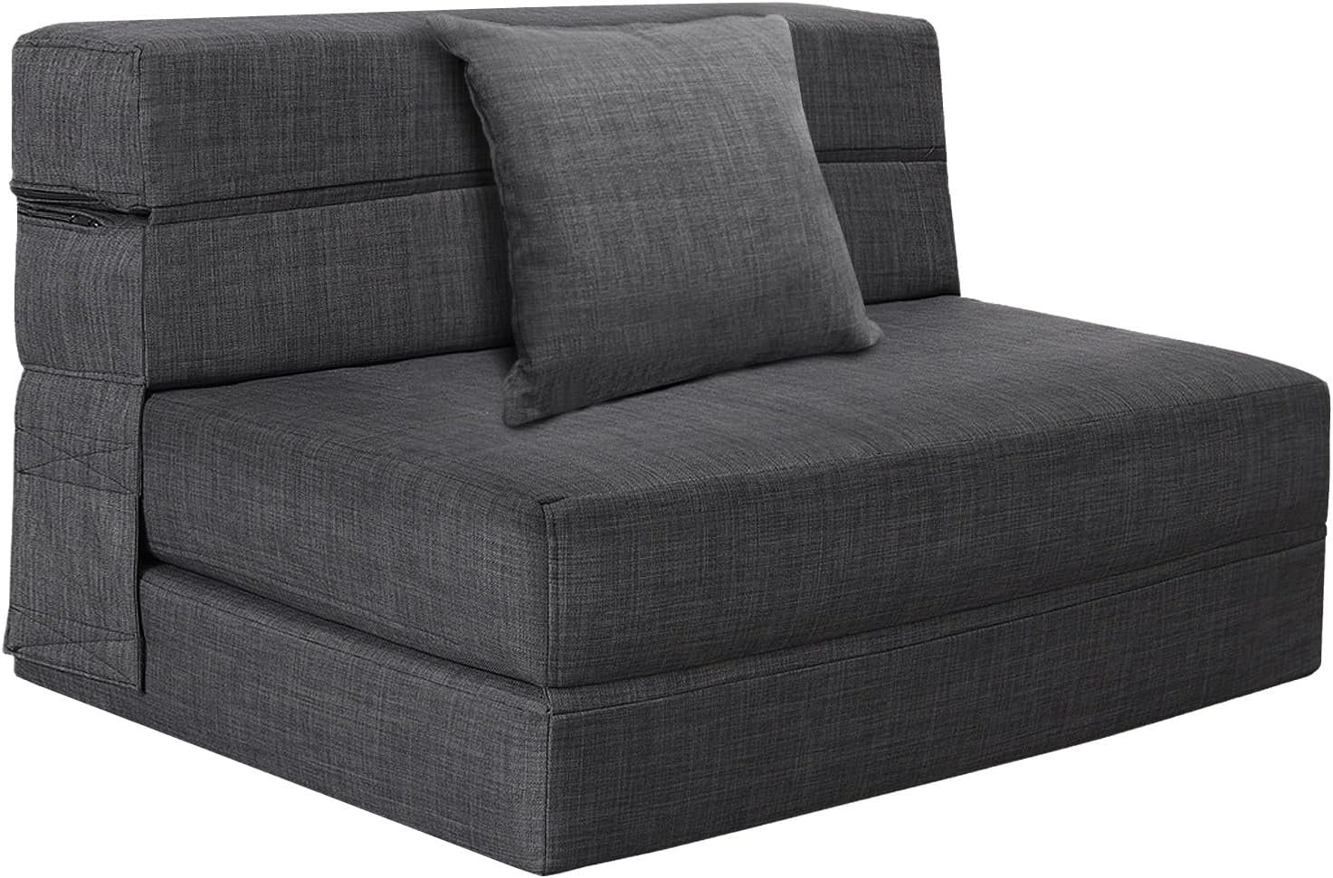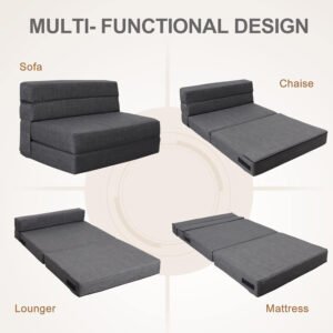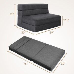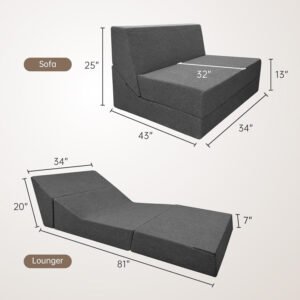 High Density Foam & Removable Fabric Cover:Fold out couch bed is made of high-density resilient memory foam, good resilience, even force, durable and not easy to deform. The zipper fabric cover is removable and washable, very easy to clean.No Assembly & Easy Conversion:This foldable chair bed requires no assembly and opens up for use. It is easy to move, fold, store and carry and can be effortlessly converted into a floor sofa, chaise lounge, recliner and mattress for your different needs.Entended Velcro Straps:The sofa bed has 7″ entended Velcro straps on both sides of the couch secure the backrest to the seat cushion, Placing against the wall will provide better support.Multifunctional Uses Space Saver:Tri-fold sofa bed is a compact convertible sofa bed used in limited modern living spaces. It’s easy to carry in and out of the RV or anywhere else space is limited. Such as living rooms,bedroom,playroom,children’s rooms,office,loft flats,college dorms,etc. You can be folds out easily when not in use.It can be easily converted into a storage space,making it very space-saving.Stylish gifts for the home:Folding sofa chair bed are both fashionable and comfortable,creates a variety of configurations,Very suitable for different people to use,making them the perfect gift for family and friends.