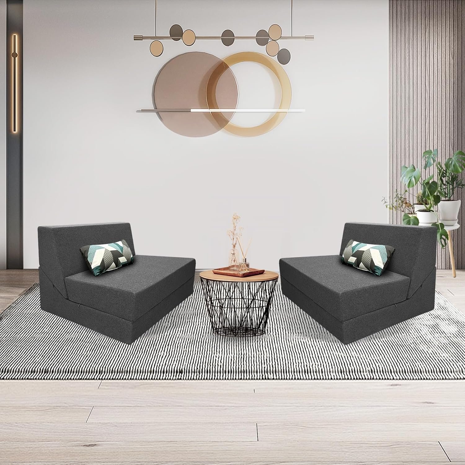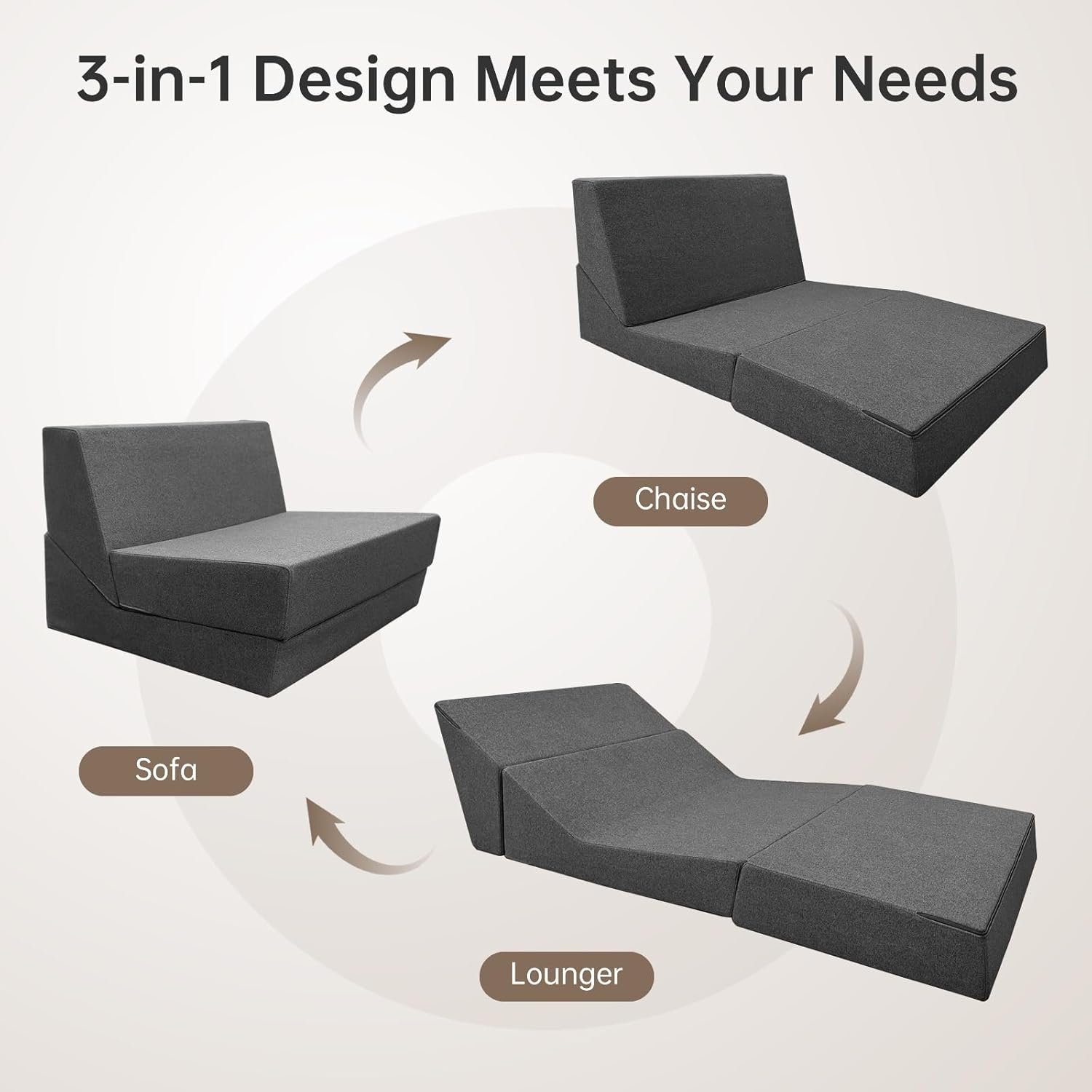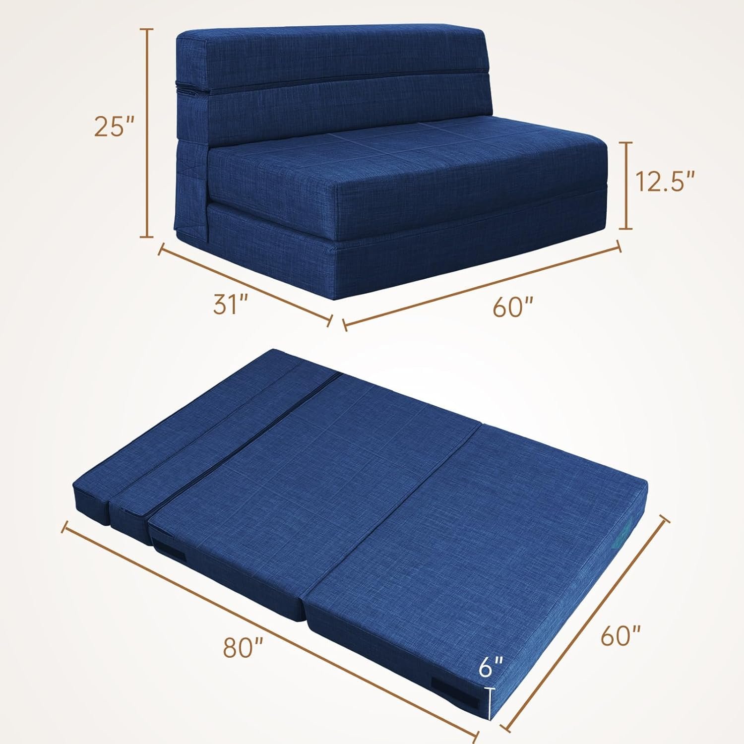 High Density Foam & Removable Fabric Cover:Fold out couch bed is made of high-density resilient memory foam, good resilience, even force, durable and not easy to deform. The zipper fabric cover is removable and washable, very easy to clean.No Assembly & Easy Conversion:This foldable chair bed requires no assembly and opens up for use. It is easy to move, fold, store and carry and can be effortlessly converted into a floor sofa, chaise lounge, recliner and mattress for your different needs.Entended Velcro Straps:The sofa bed has 7″ entended Velcro straps on both sides of the couch secure the backrest to the seat cushion, Placing against the wall will provide better support.Multifunctional Uses Space Saver:Tri-fold sofa bed is a compact convertible sofa bed used in limited modern living spaces. It’s easy to carry in and out of the RV or anywhere else space is limited. Such as living rooms,bedroom,playroom,children’s rooms,office,loft flats,college dorms,etc. You can be folds out easily when not in use.It can be easily converted into a storage space,making it very space-saving.Stylish gifts for the home:Folding sofa chair bed are both fashionable and comfortable,creates a variety of configurations,Very suitable for different people to use,making them the perfect gift for family and friends.
