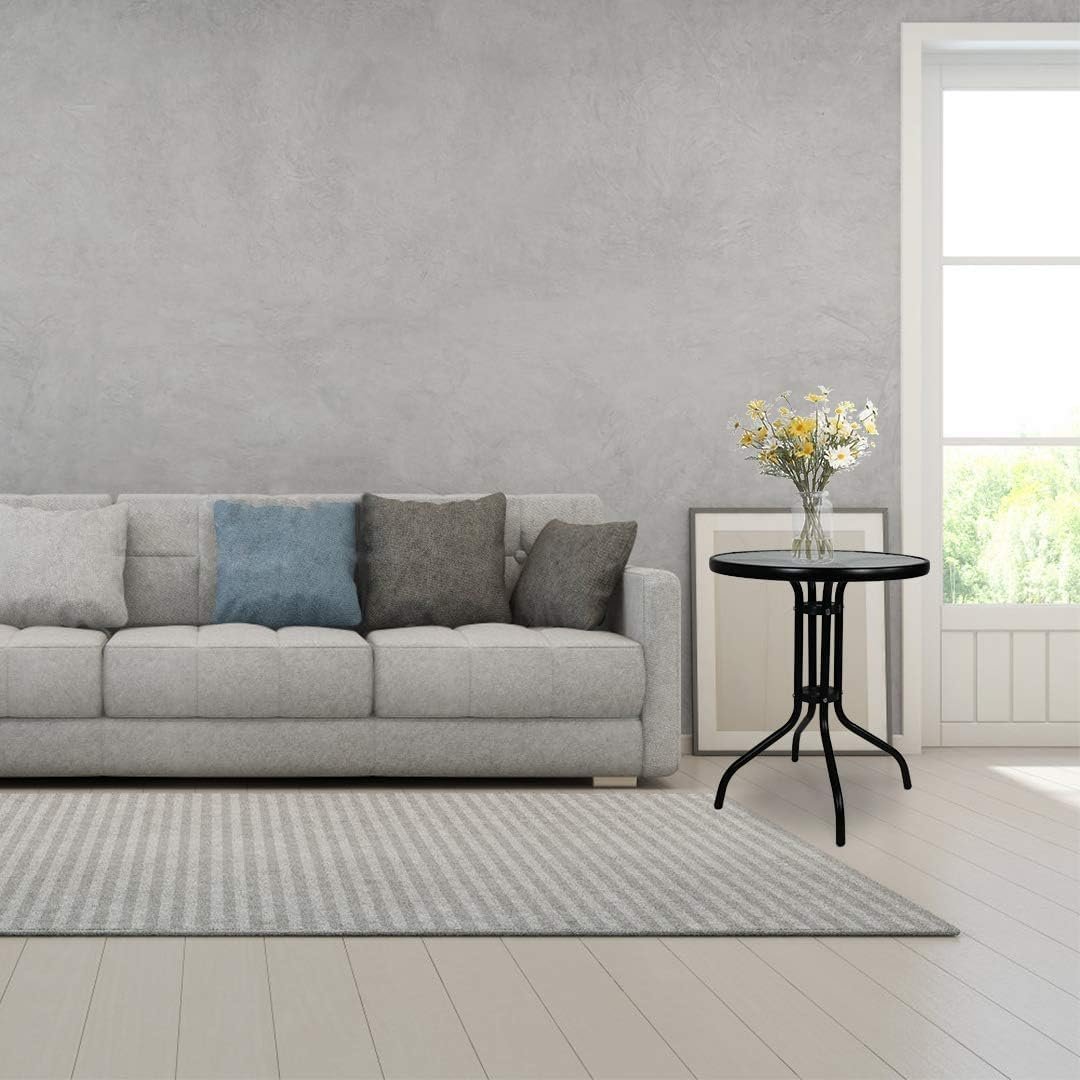 Outdoor Patio Side Table with Glass Top, Round 60 cm, Brown Metal Frame (Black)