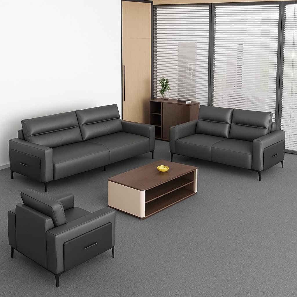 Poppins HOME Modern Office Leather Sofa Set – 3+2+1 Seater | Minimalist PU Leather Couch | Elegant Seating for Living Room, Lounge, or Reception Area (Grey, 3+2+1 Seater)